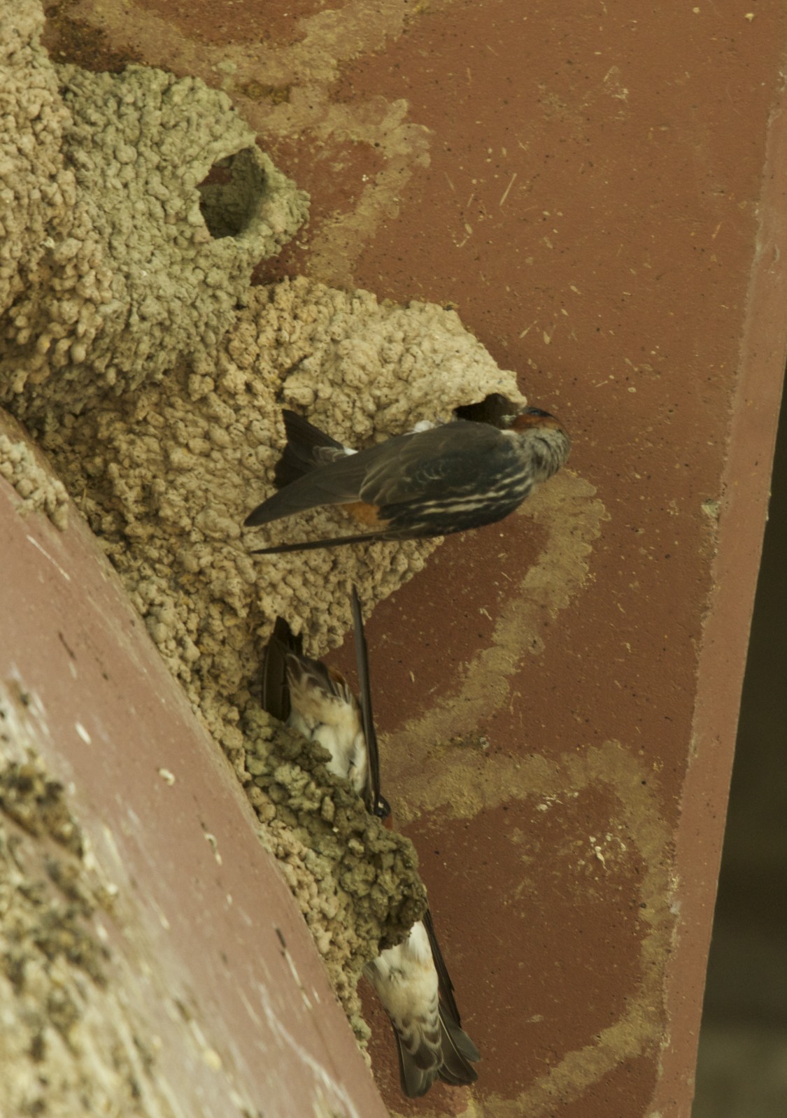 They then bring the mud up to their nest, sometimes to construct of their own design and energy, and other times to merely drop off the raw materials for a waiting mate in the semi-finished structure. This dynamic was very curious.